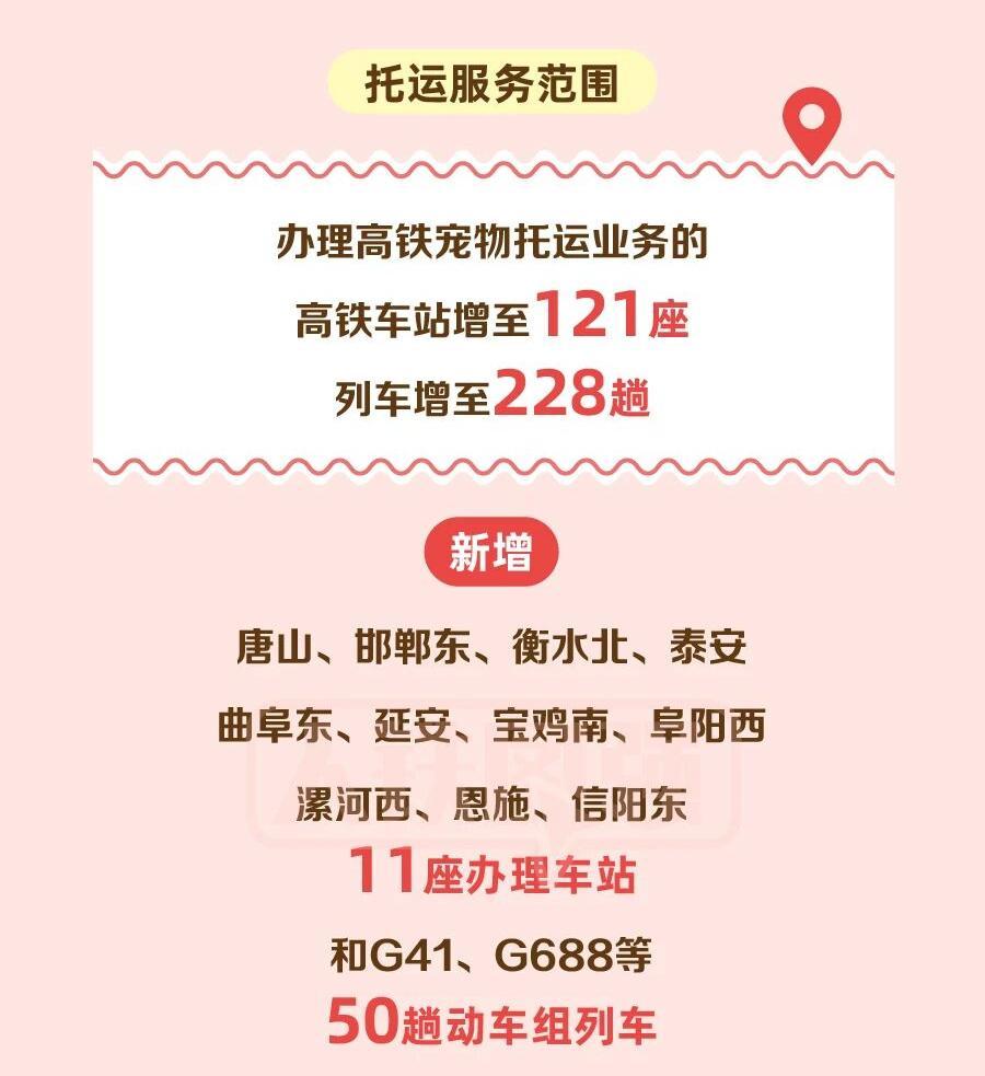 目前,全国已有超120座高铁站、200余趟标注“宠”字标识的高铁动车组开通此项服务,覆盖北京、上海、广州、深圳、成都、重庆、西安、武汉等全国各大主要城市。铁路部门表示,后续将持续优化服务流程、扩大服务覆盖范围,进一步提升宠物运输服务质量。