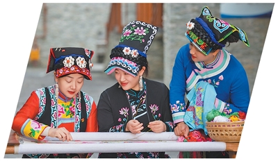 北川羌族自治县政协委员、云珍羌绣专业合作社负责人陈云珍(左一)教授羌绣技艺。