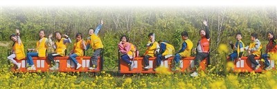 重庆市北碚区歇马街道虎头村,青少年们乘坐小火车感受乡村田园之美,乐享春日假期。