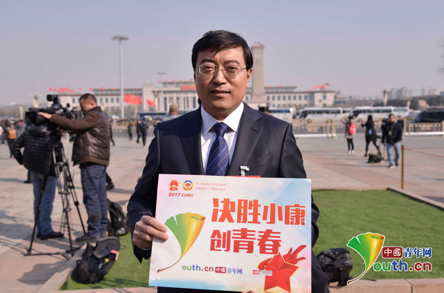 全国政协委员潘刚手持“决胜小康创青春”,为中国青年点赞!中国青年网记者 周学磊 陈乐川 摄