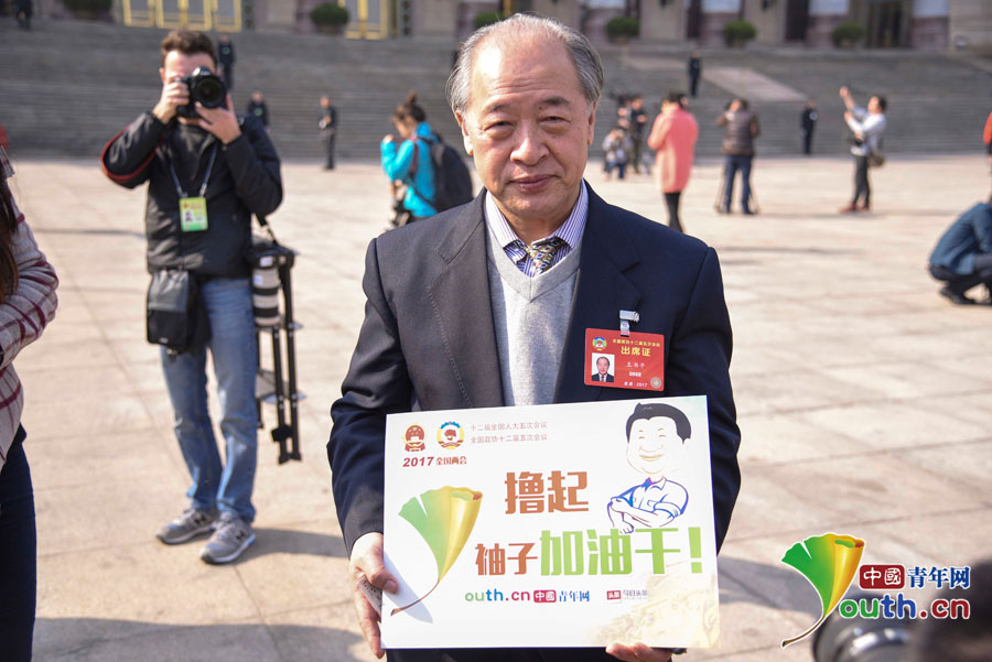 全国政协委员王书平手持“撸起袖子加油干”,为中国青年点赞!中国青年网记者 周学磊 陈乐川 摄
