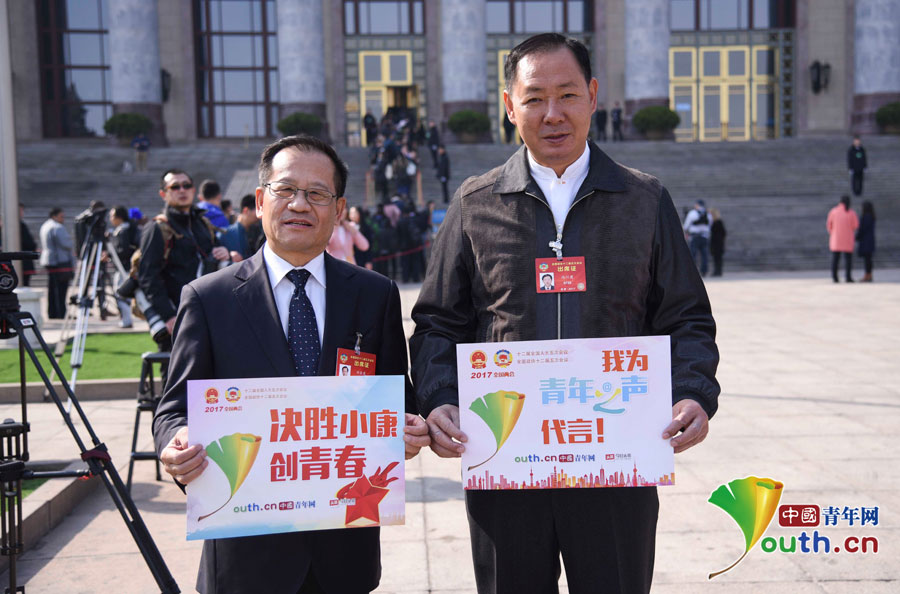 全国政协委员刘金虎、冯川建分别手持“决胜小康创青春”和“我为青年之声代言”为中国青年点赞!中国青年网记者 周学磊 陈乐川 摄