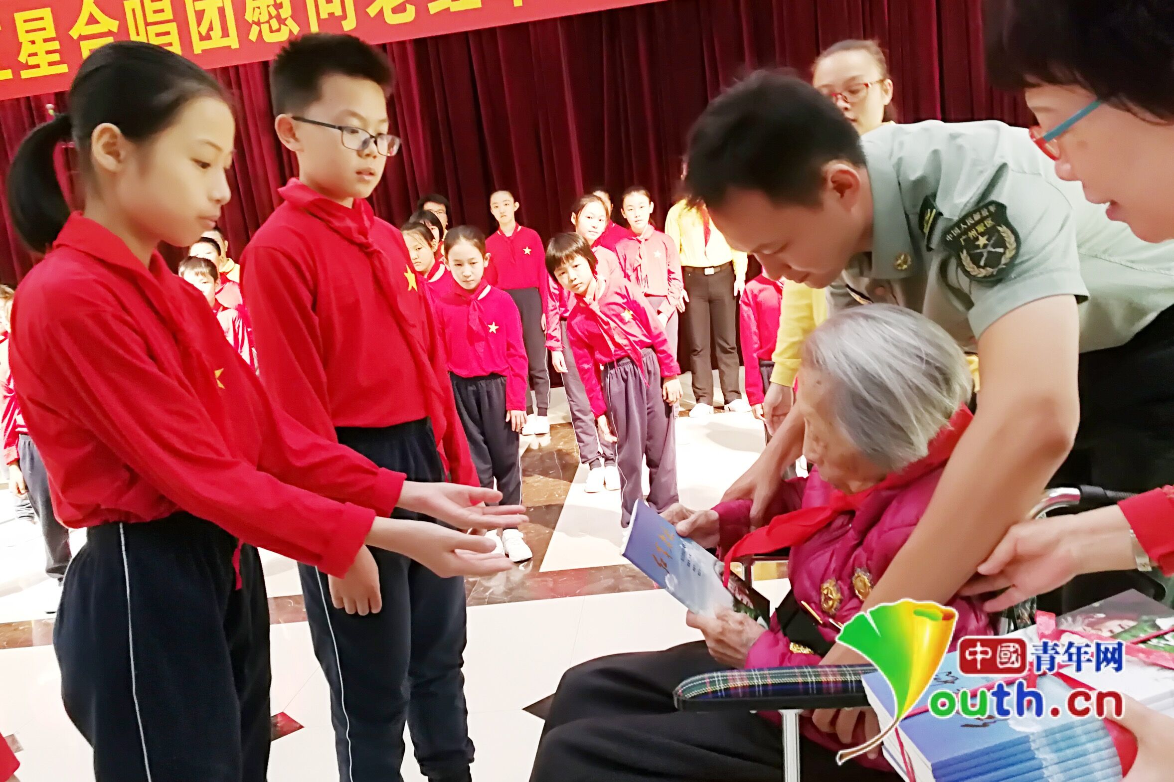 中国青年网北京11月7日电(见习记者 马珊 通讯员 姜润邈)11月5日,广州闪闪红星合唱团30多名孩子在老师的带领下,来到驻广州某干休所,看望慰问黄海云、陈逊、陈冰克3位年近百岁的革命老前辈。