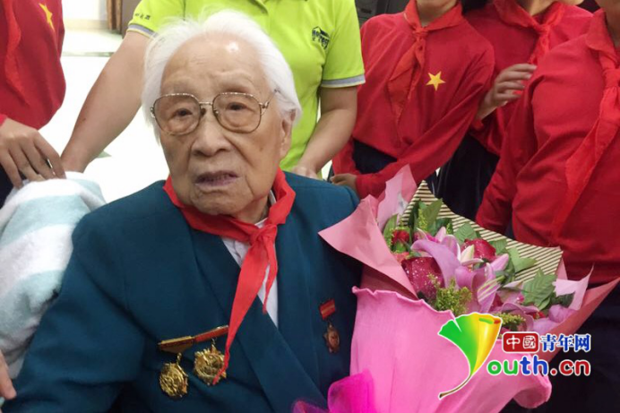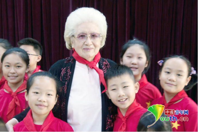 现年100岁高龄的老红军黄海云为孩子们赠送图书《红军老妈》。通讯员 姜润邈 摄