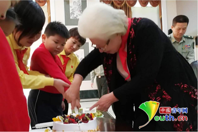 孩子们为奶奶们系上了红领巾、献上了鲜花,送上了祝福蛋糕并表演了精心准备的文艺节目。合唱《我们是共产主义接班人》《红星歌》《习爷爷是我们的大朋友》气势磅礴,铿锵有力。精彩的节目,抒发了孩子们对老一辈革命家的崇敬之情,老人们看着孩子们精心准备的节目也倍感温暖。