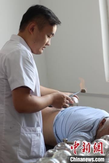 在接受中新社记者采访的过程中,新疆生产建设兵团第十四师47团医院中医馆医师艾乐松不停起身,在各个诊疗室里来回转——针灸、推拿、拔火罐,照料着等待他的患者。