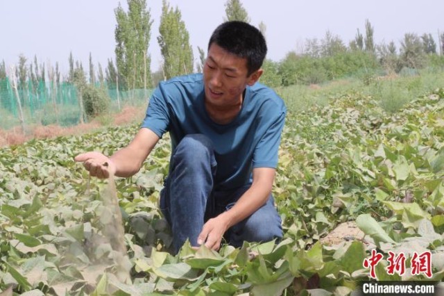 2023年8月,新疆生产建设兵团第十四师47团西部计划志愿者王志强捧起红薯“示范田”的沙性土壤。 曾玥 摄