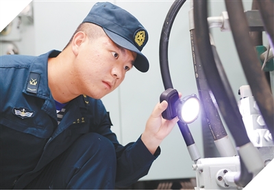 一次补给任务中,正在战位上操作的王佩宁,突然发现柴油阀门遥控系统上某一个比例阀警示灯亮起。“一个阀门,也有可能引发大问题。”王佩宁立刻钻进管路之间开始排查。